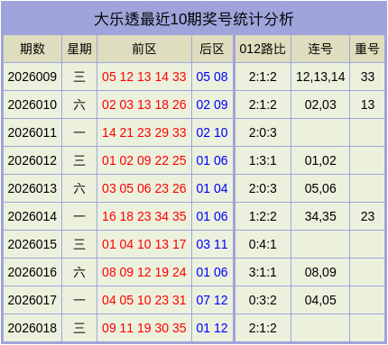 后分离析:上期开出后区01、12,最近10期的后区奇偶比为10:10,本期情切【偶奇】数后区,看好后区号码:08、11。