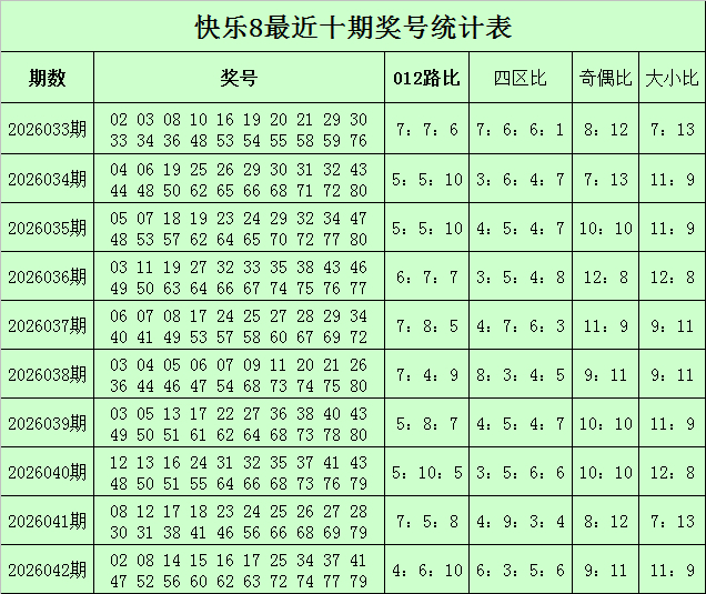 福彩欢乐8第2026042期开奖转头:02 08 14 15 16 17 25 34 37 41 47 52 56 60 62 63 72 74 77 79,其中奖号012路比为4:6:10,四区比为6:3:5:6,奇偶比为9:11,大小比为11:9。